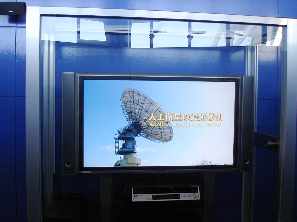 受付のとなりの展示室では、施設の説明ビデオ(「人工衛星の追跡管制」・13分)や、ISASはこんなことやってますよパネルなんかが展示してある。 展示室をうろうろしている間に、もう一組見学者が到着。 ここで見学者同士がはちあわせするなんて、滅多にないことなんじゃない?