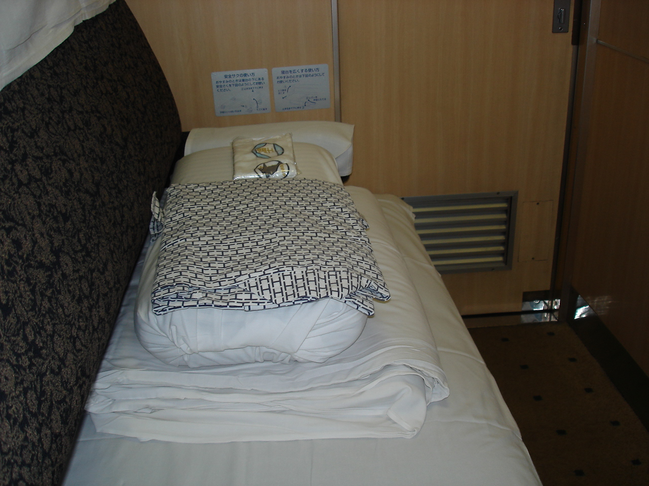 お弁当を持ったまま置き去りにされると困るので、適当な車両から乗り込み、B寝台車の通路を歩く。 ほとんどの寝台が埋まっている模様。 開放B寝台は、ひとり旅では敬遠してしまう。 見ず知らずの人と顔を突き合わせるには、いささか窮屈そう。