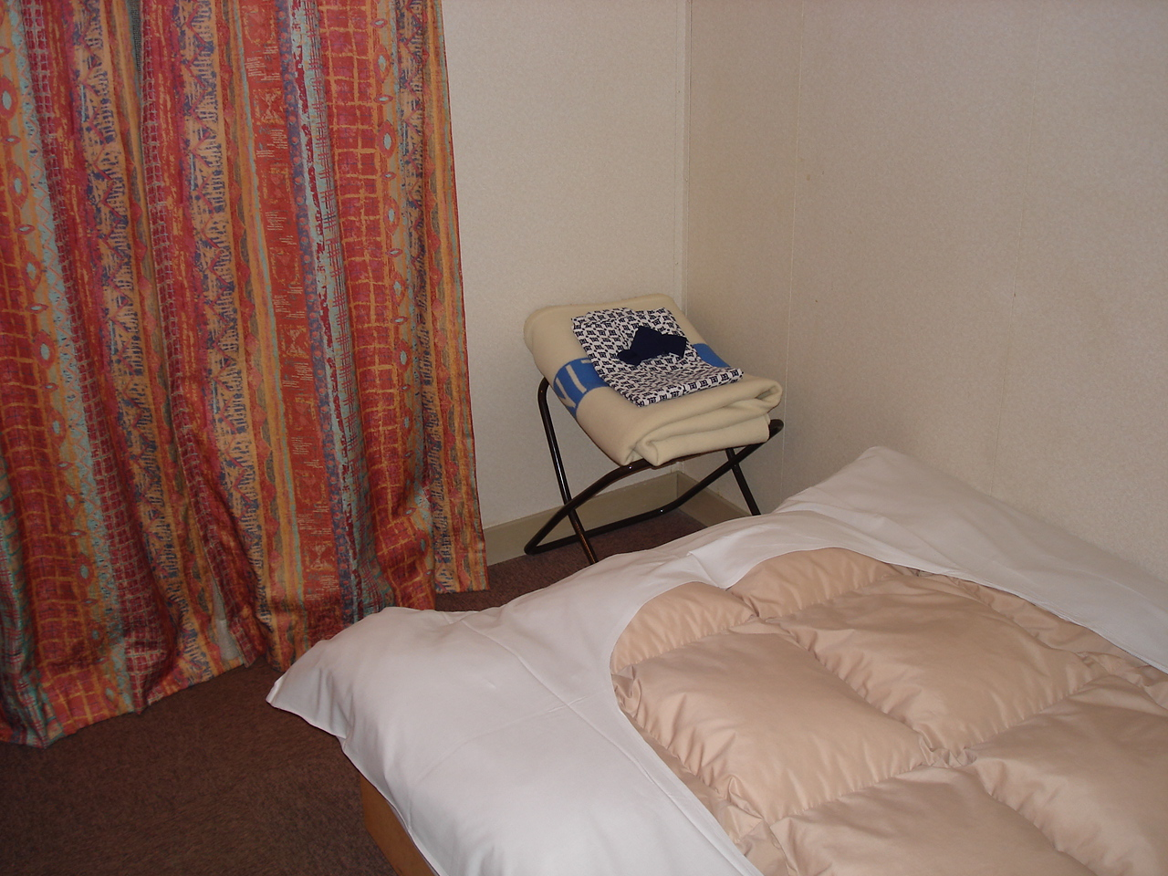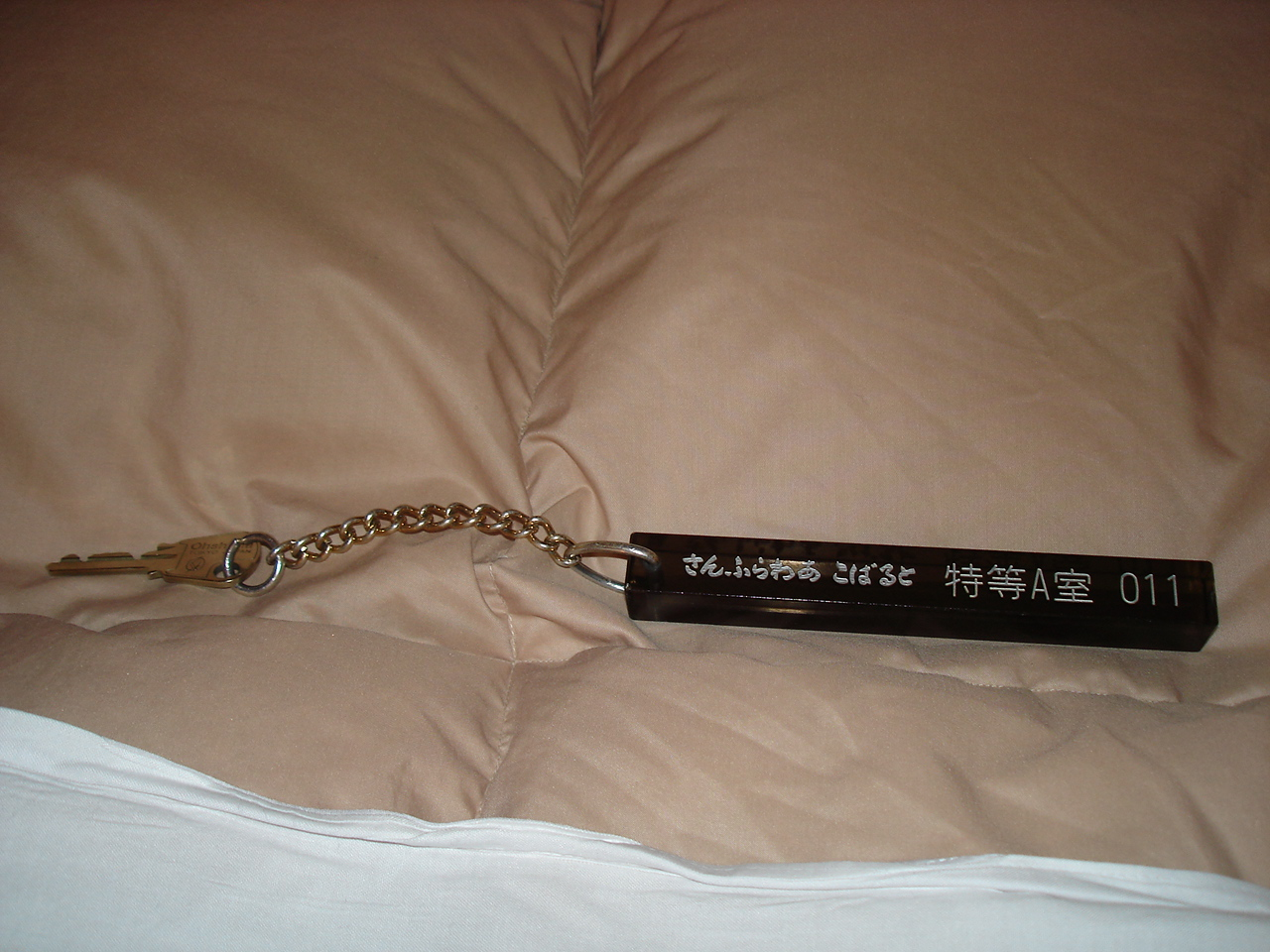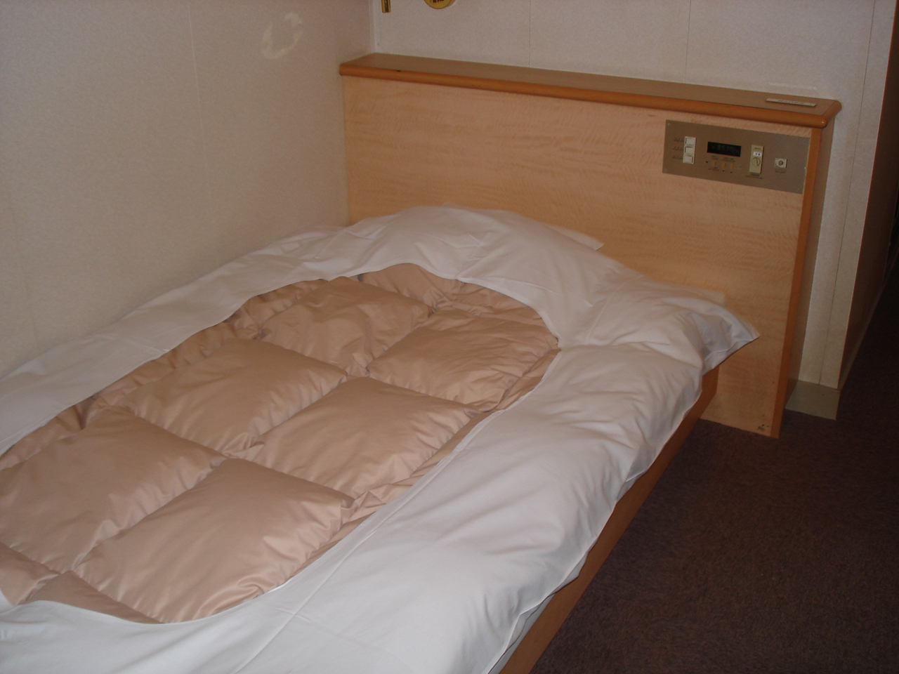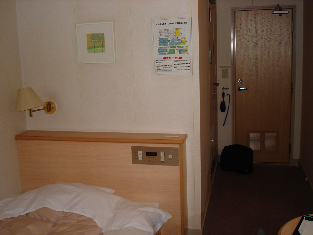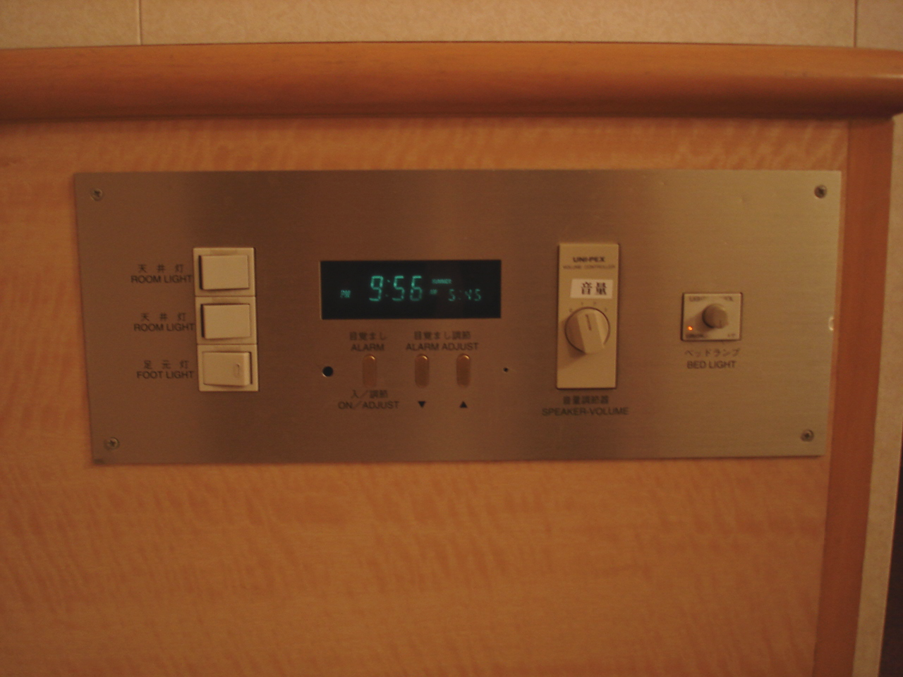 20:20頃、乗船案内。 岸壁から階段を昇って船に乗る。 案内所でルームキーを受け取り、部屋へ。 進行方向左側の部屋だ。 特等室は、太平洋フェリーの特等室ほどの広さはないけど、快適そう(あ、あっちは二人用か...)。 ひとり用の個室があるのはうれしい。