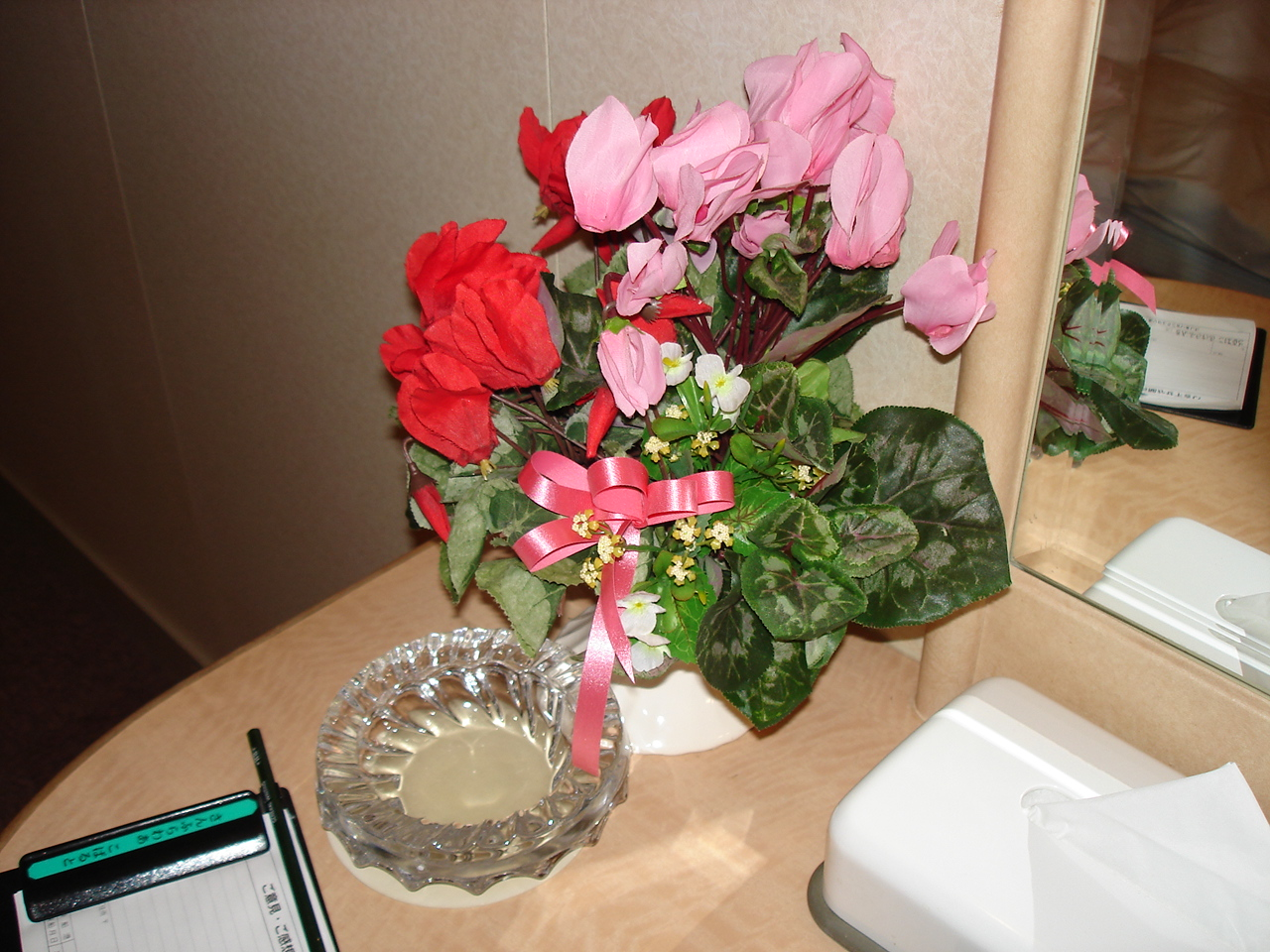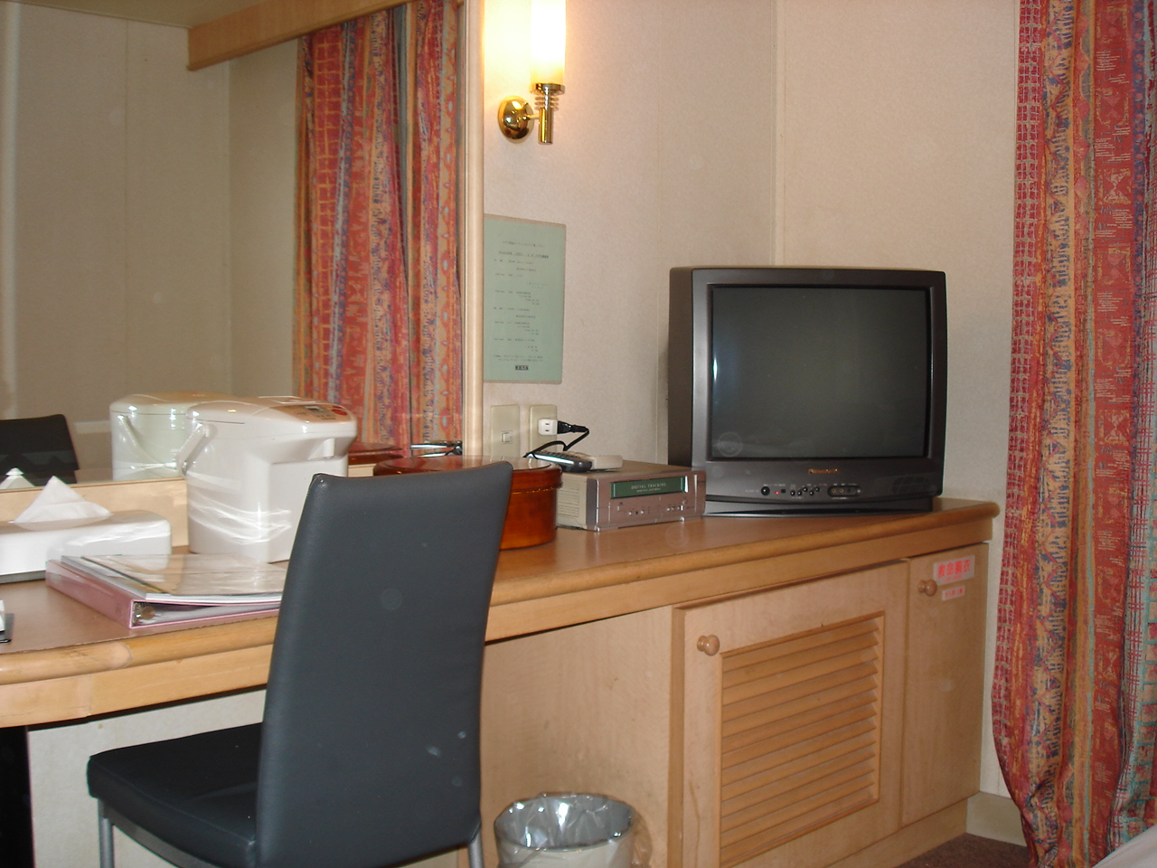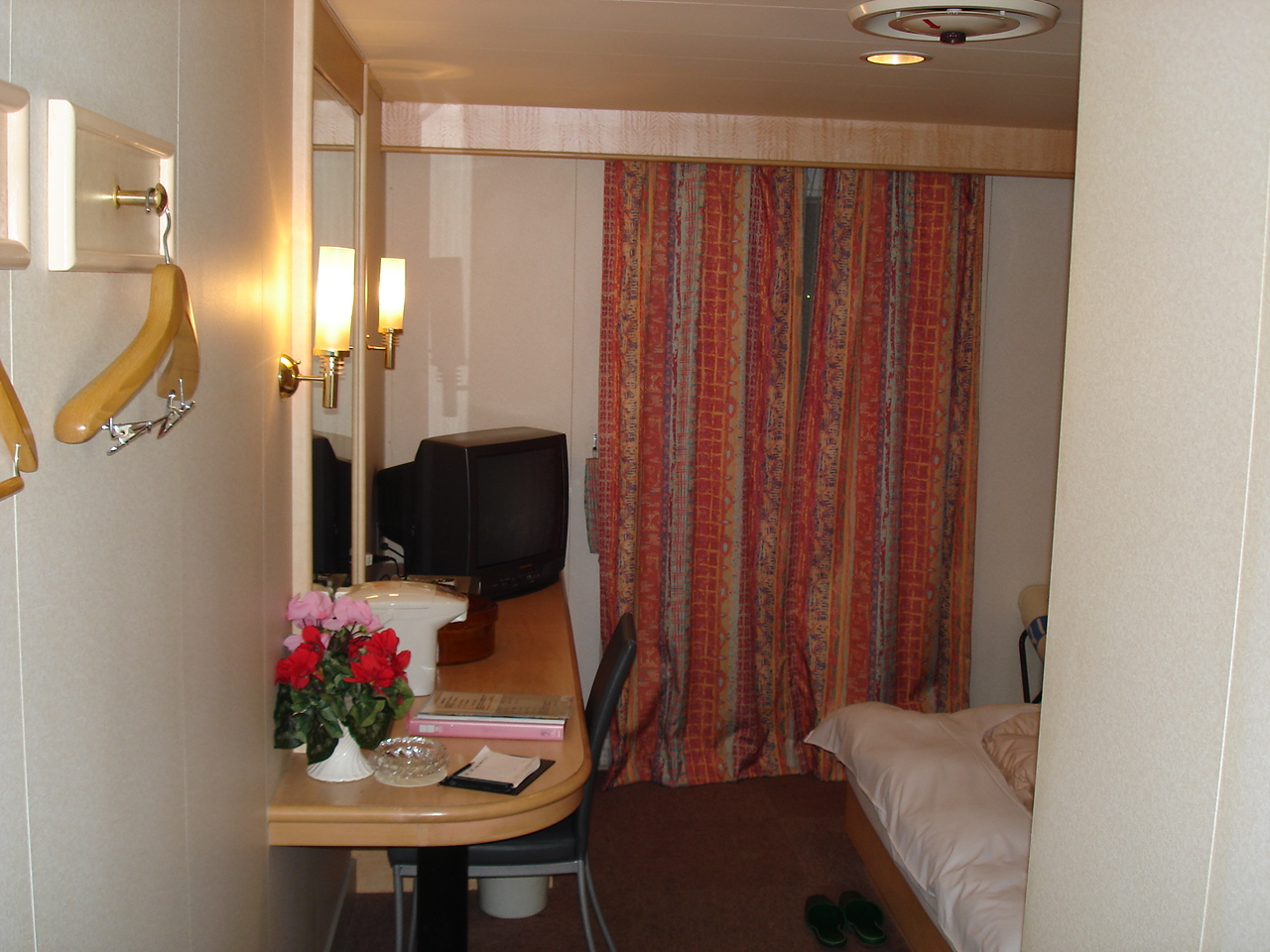 お茶セットや冷蔵庫やテレビ(BSと地上波が見られる模様)など、ひととおりの物が揃っている。 花が飾ってあるのが、ちょっとうれしい。 ビデオデッキは、船内サービスのレンタルビデオを見るため。