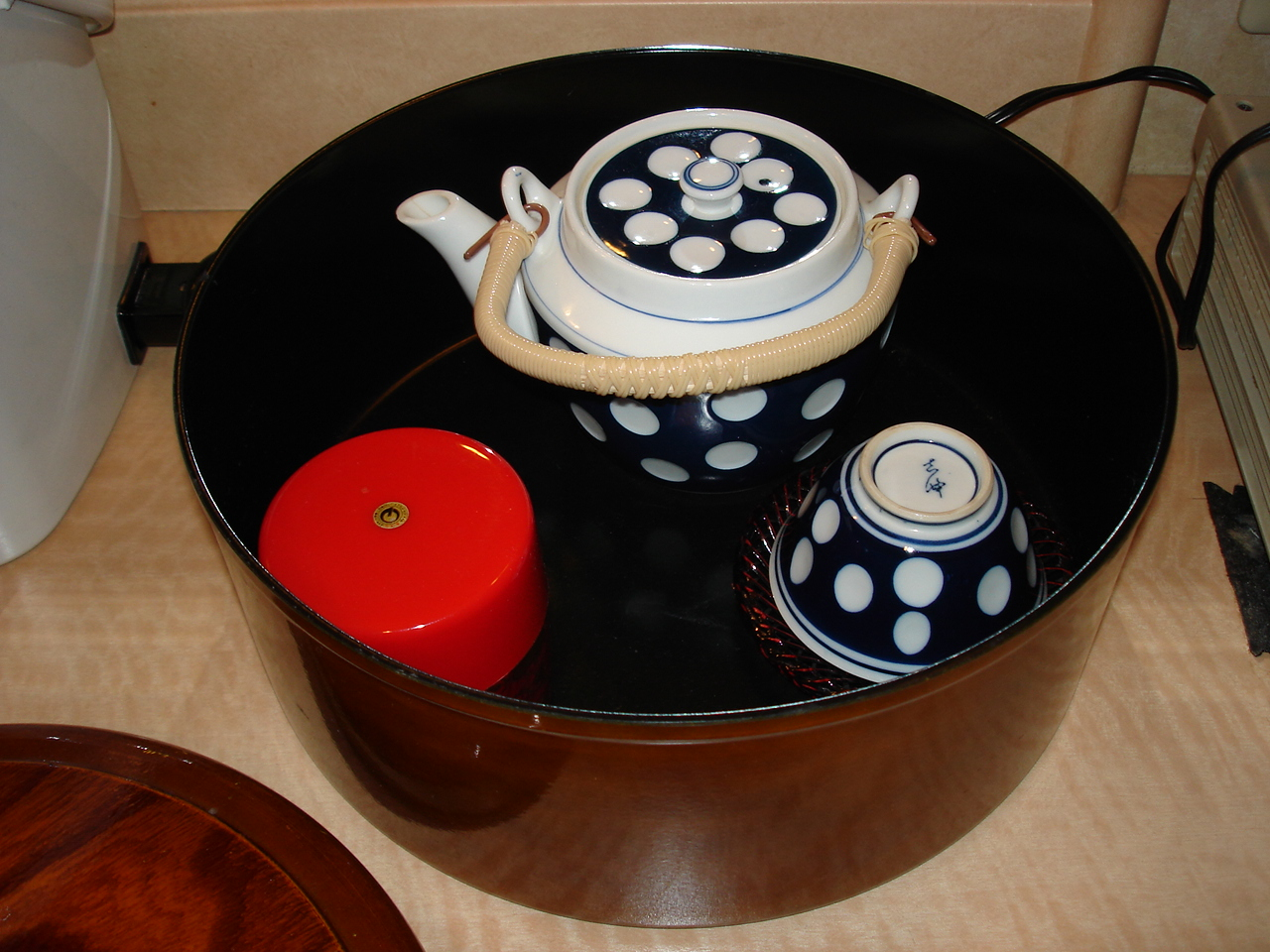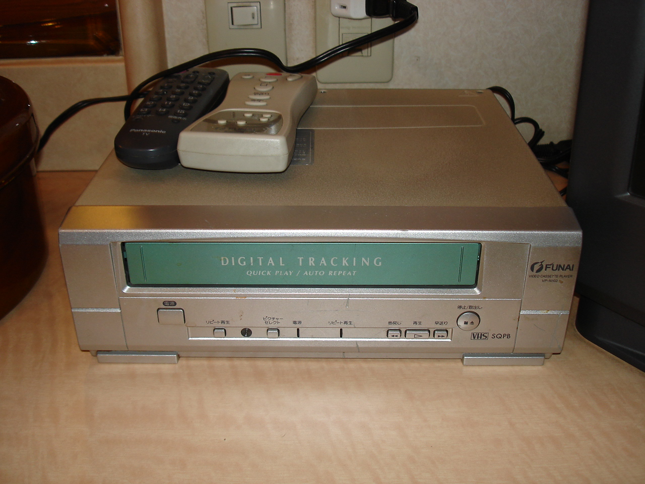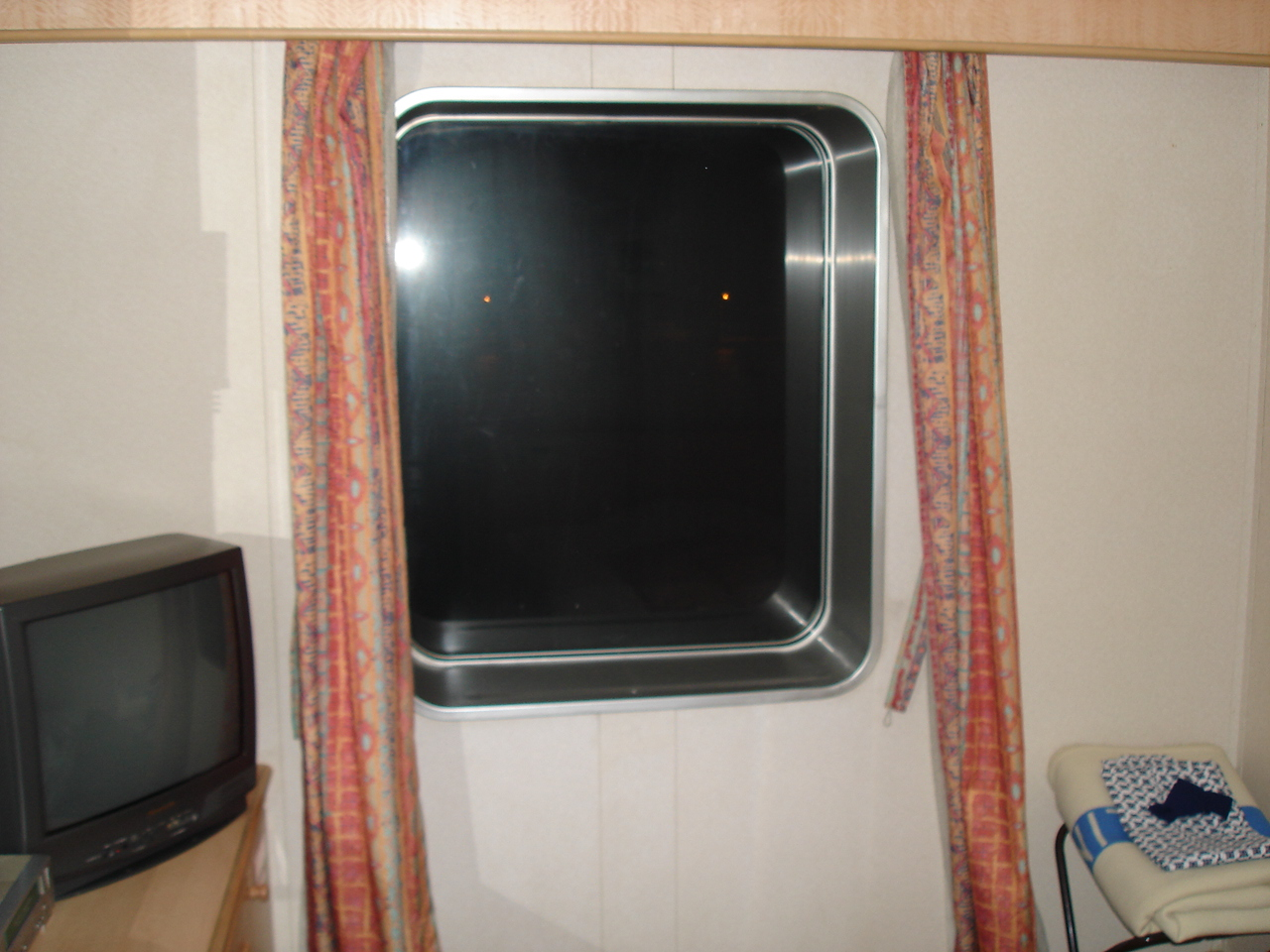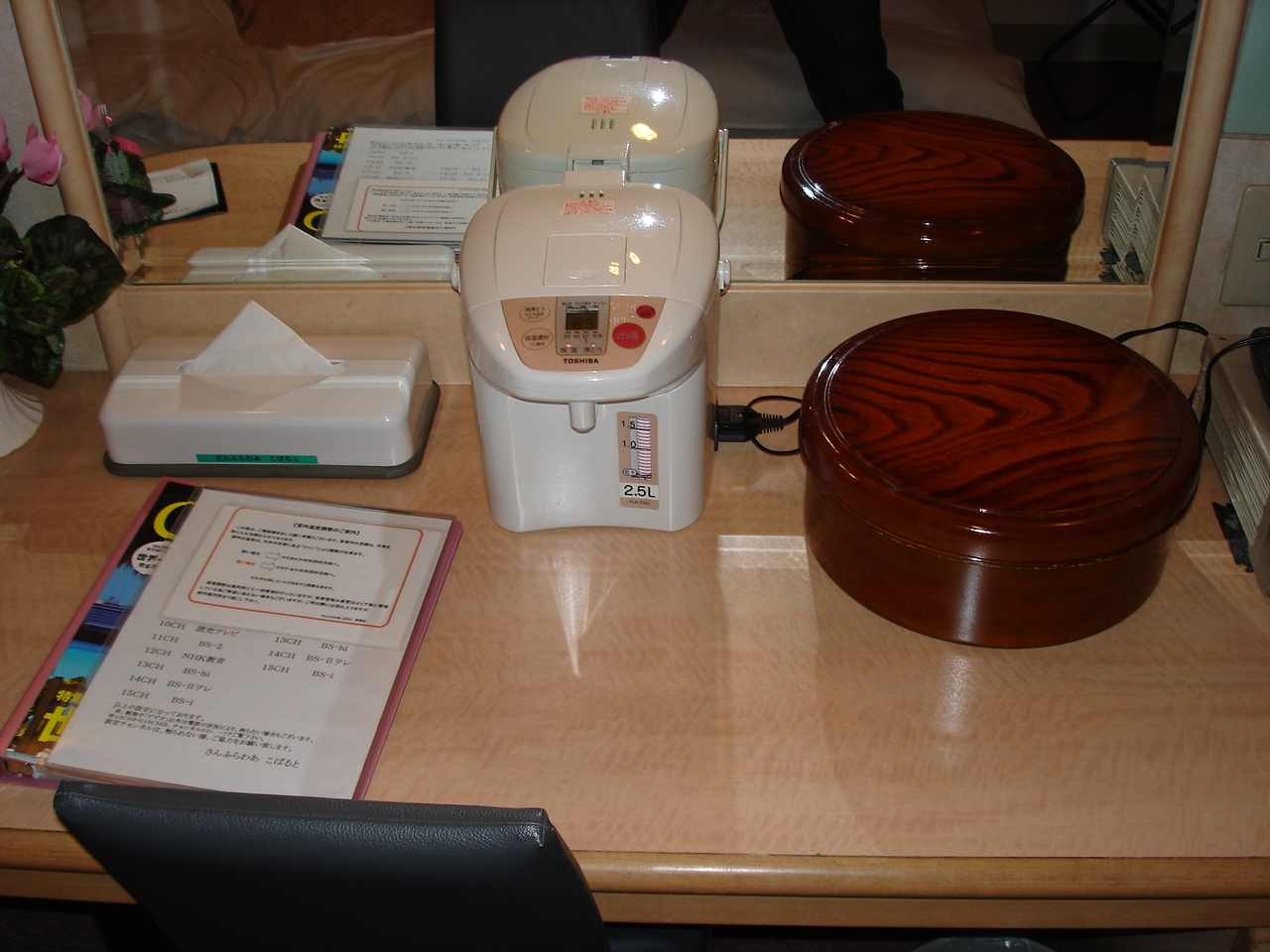 お茶セットや冷蔵庫やテレビ(BSと地上波が見られる模様)など、ひととおりの物が揃っている。 花が飾ってあるのが、ちょっとうれしい。 ビデオデッキは、船内サービスのレンタルビデオを見るため。
