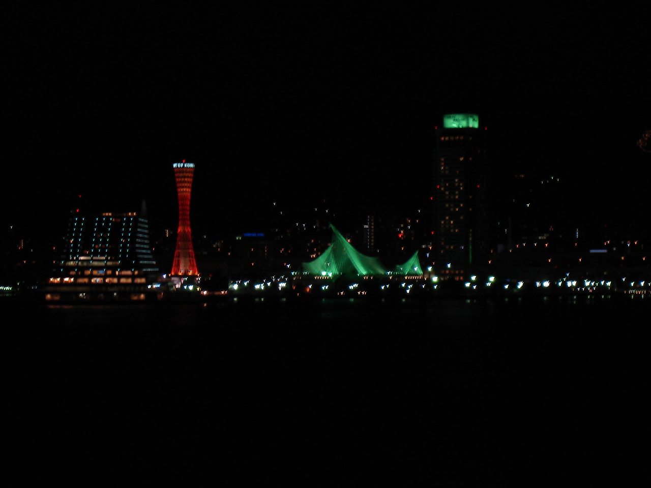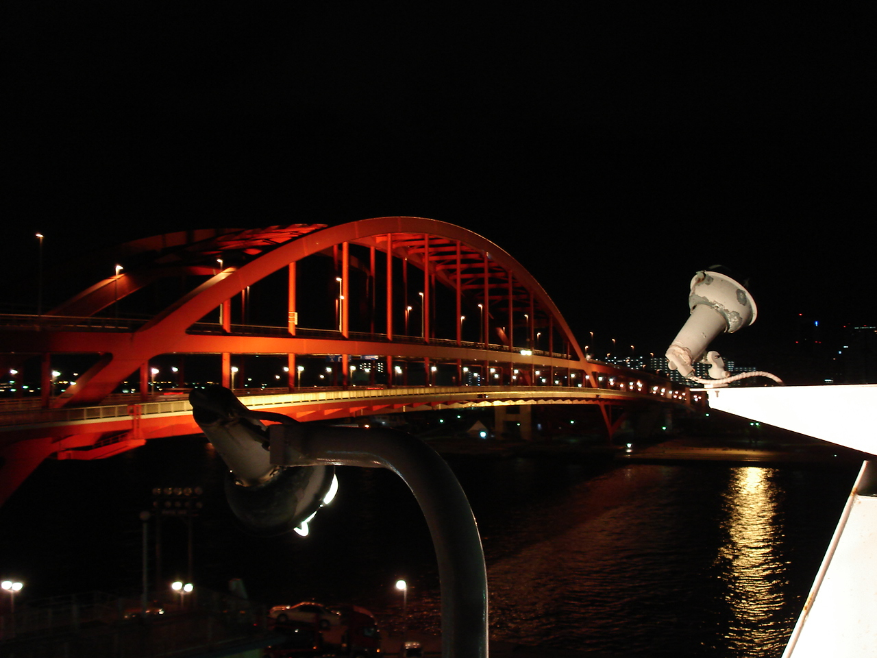 23:20頃、明石大橋の真下を通過。 きれい。 星もきれい。 天文科学館もライトアップされていて、よく見える。