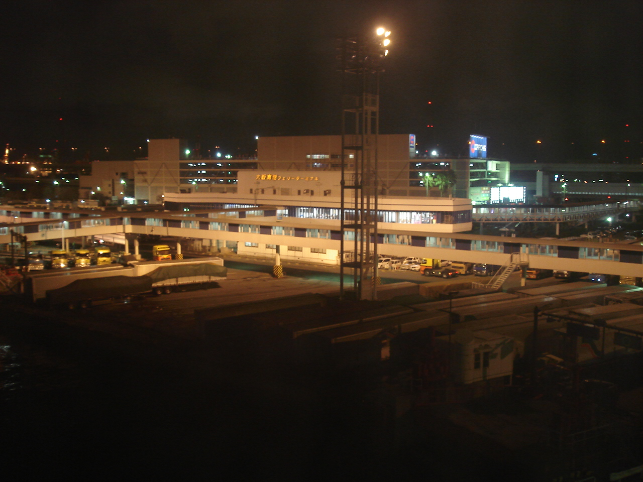なんばからは四つ橋線で住之江公園へ向かうつもりだったのだけれど、うろうろしても四つ橋線が見つからない。 やむを得ないので、御堂筋線でおとなりの大国町へ行き、四つ橋線に乗り換えることにする。 大国町では、同じホームで乗り継ぎができた。 四つ橋線終点の住之江公園から大阪南港最寄りのフェリーターミナル駅まで、新交通システムの南港ポートタウン線を利用。 住之江公園のエスカレータでは、なぜか右側を空けていた。 新交通システムに乗るのは、すごく昔に乗ったポートライナー以来のような気がする。 フェリーターミナル駅からは、長い連絡通路を通って南港フェリーターミナルへ向かう。 1F窓口で乗船名簿を記入して、料金を支払う。 乗船までは、待合室でお笑い番組を見て過ごす。