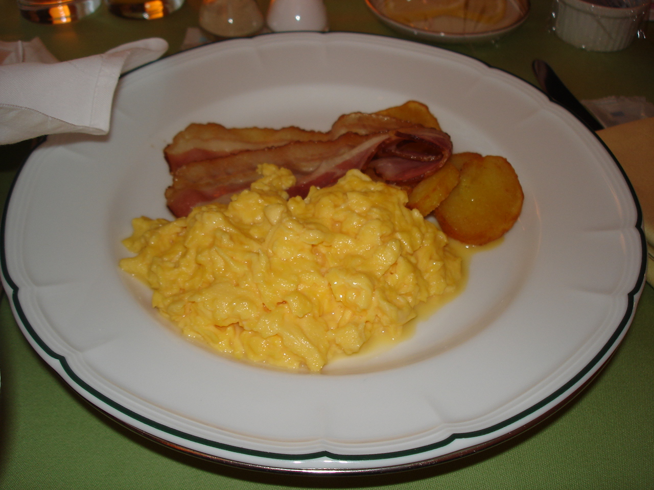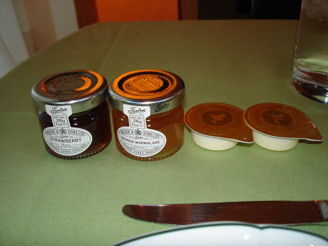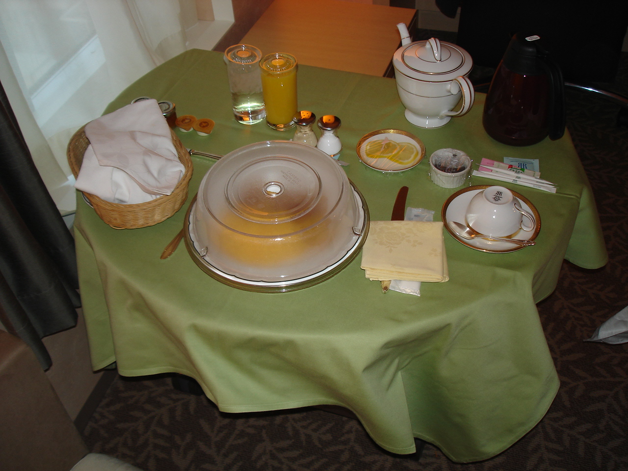 7:00に起床して、ルームサービスを迎えるための身支度。 7:30に朝食がきた。 卵料理はスクランブルエッグ、付け合わせはベーコン、ジュースはグレープフルーツ、パンはクロワッサン、飲み物は紅茶を選択してみた。 パン用に、ストロベリージャムとオレンジマーマレード、バターが付属する。 値段は少々張るけれど、朝からしっかり食べられるのはうれしい。 温かい紅茶も飲めるし。 食べ終わった後は、コールして食器をさげてもらう。