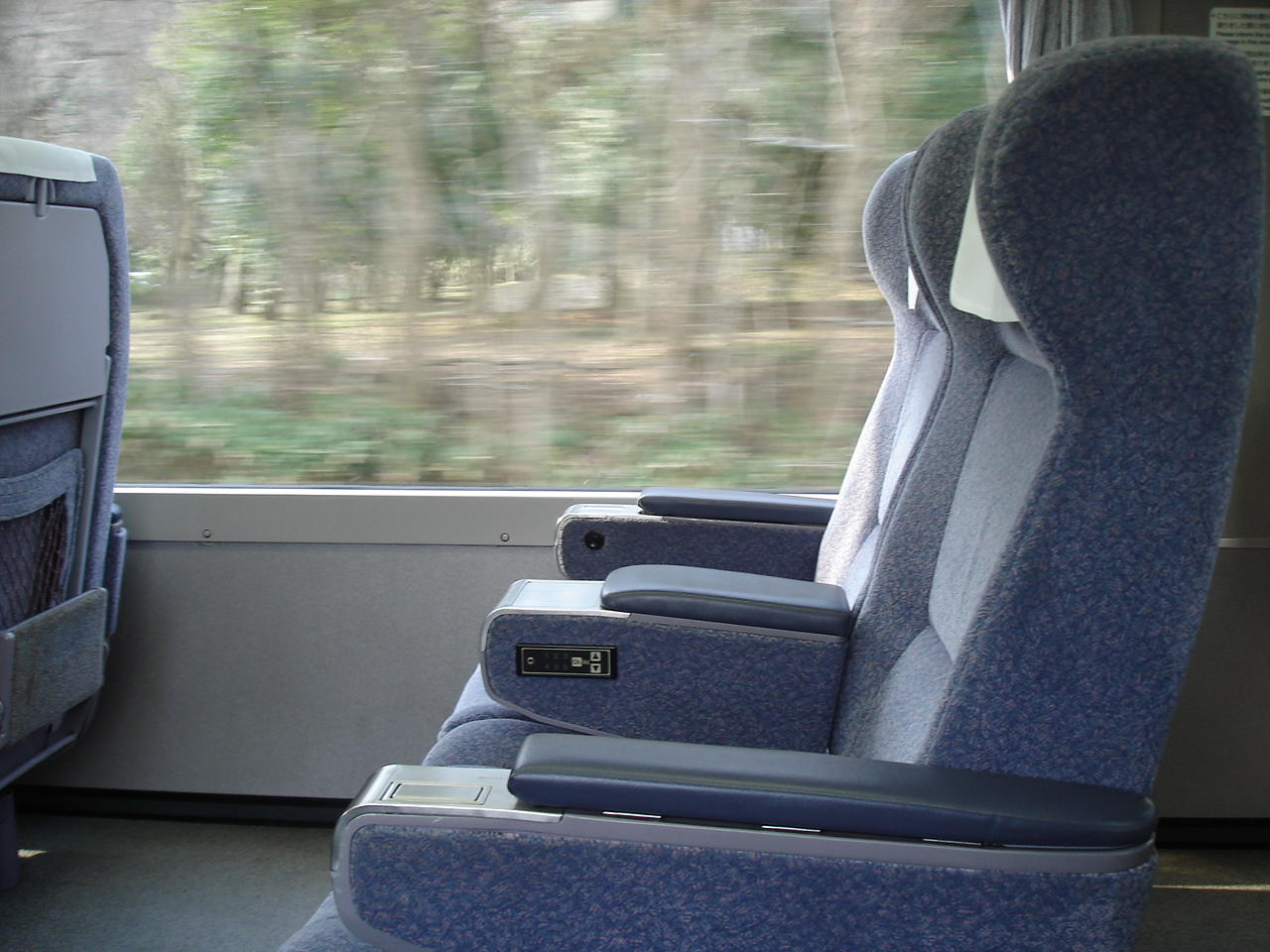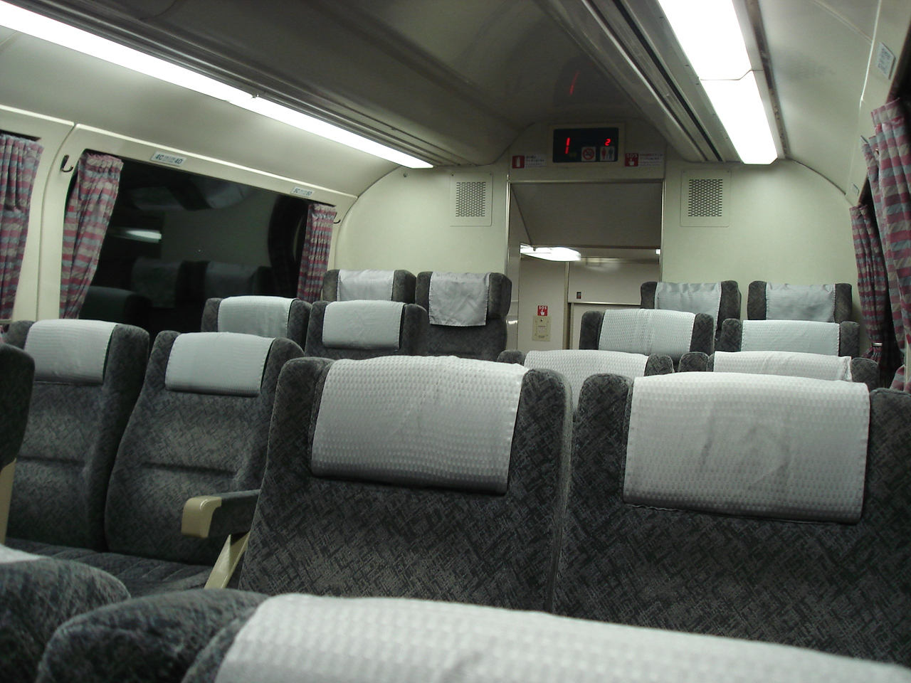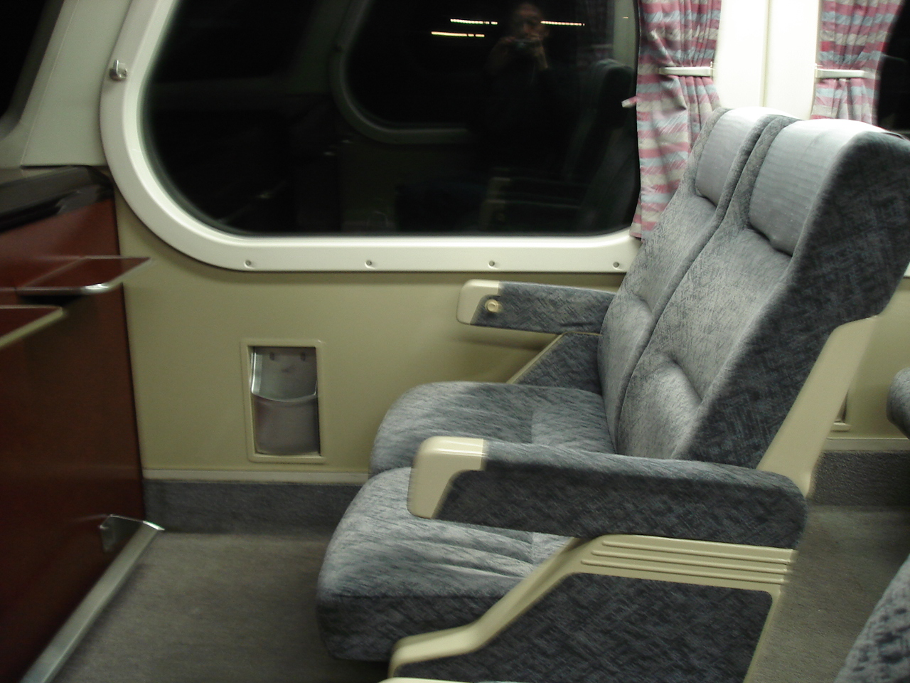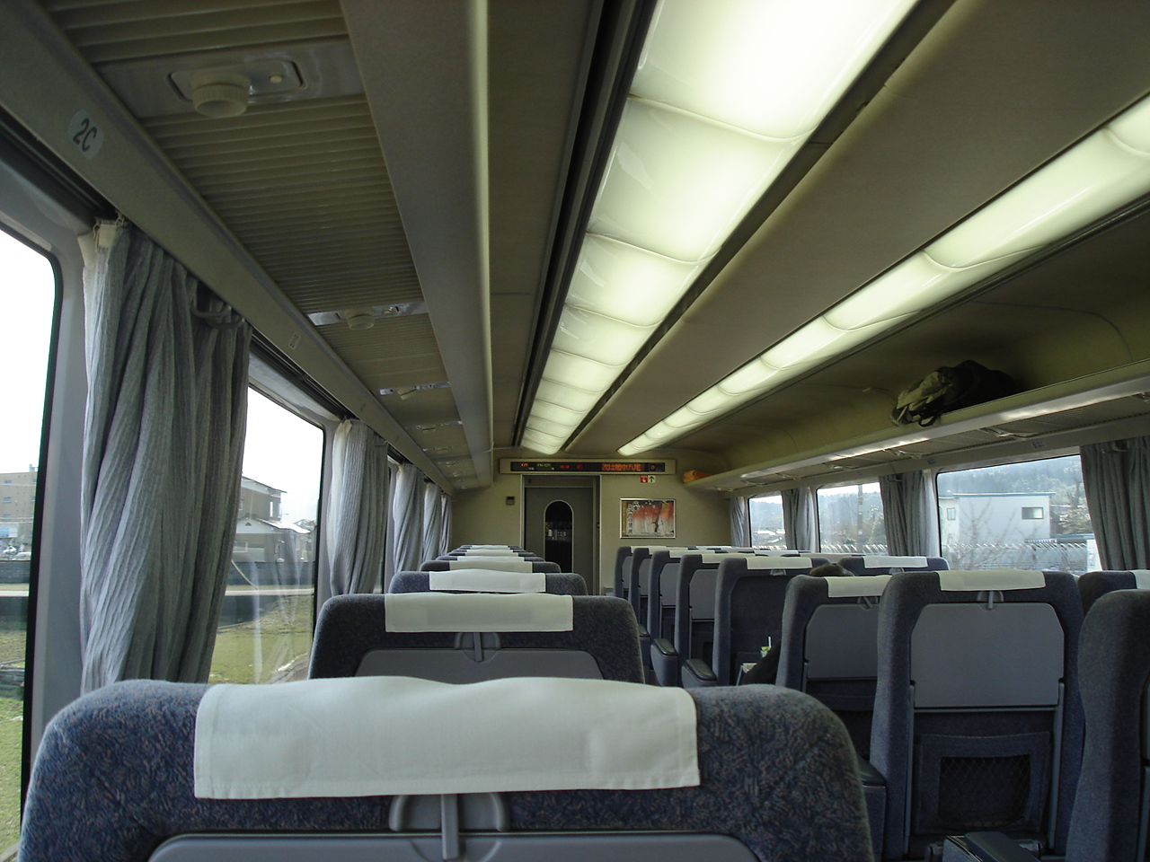 14:55頃、列車は3番線に入線したものの、車内清掃のためすぐには乗車できない。 15:00頃乗車。 車内はとてもきれい。 窓が大きくてさわやかな感じ。 ハイデッカーなので、通路と座席に少し段差がある。 グリーン車はほとんど乗客がいないまま富山を出発する。 富山を出てすぐに検札がある。