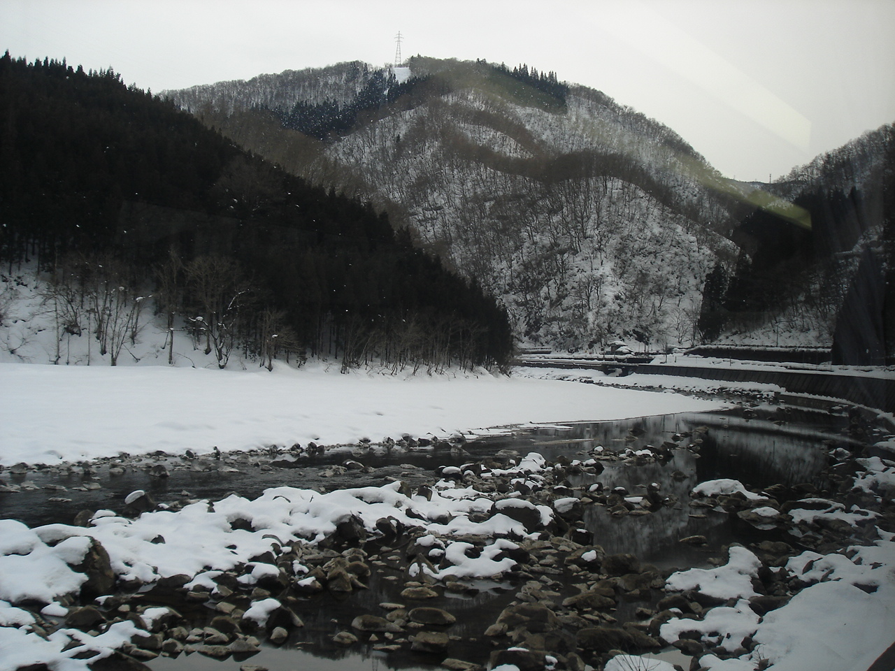 倶利伽羅付近のトンネルを抜けると、やはり濃霧のため徐行運転となる。 通路の向こうに座っている二人連れもひだ6号に乗り継ぐらしく、時間を心配している。 検札に来た車掌さんは、たぶん間に合うだろうとの返事。 高岡を17分遅れで発車。 予定では、富山での乗り継ぎ時間は20分強なので、あまり遅れてもらっては困る。