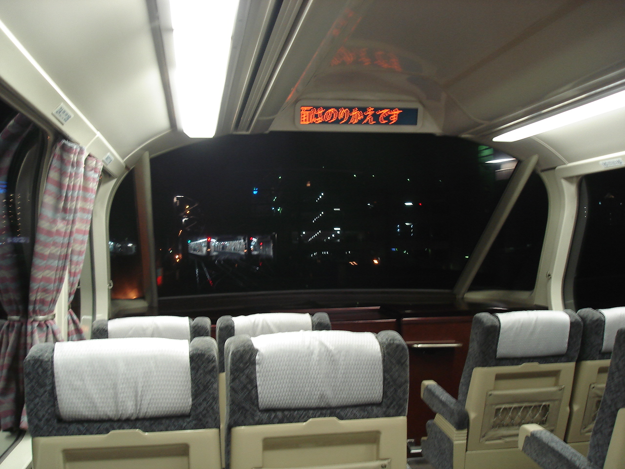 岐阜を出発した時点で、展望席はひとりだけ。 自由席ならば追加料金を払わなくてもよい列車なので、わざわざ追加料金を払って展望席を選択するような酔狂な人はいないのかもしれない。 パノラマスーパーは運転席の上に展望席があるので、運転士さんの呼称がよく聞こえる。 今回はまっ暗なので景色はそれほどよくないけれど、すれ違う列車や通過する駅を眺めるだけでも楽しい。