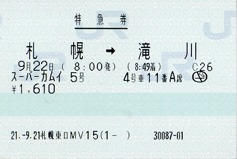 | 8:00 発 | 特急スーパーカムイ5号(旭川行き) モハ784-505 4号車/5両 11番A席 普通車指定席 |