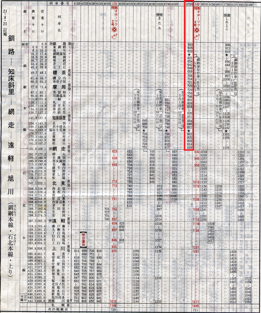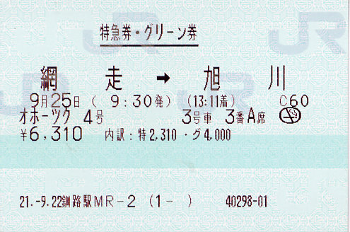 | 9:30 発 | 特急オホーツク4号(札幌行き) キロハ182-4 3号車/6両 3番A席 グリーン車指定席 |