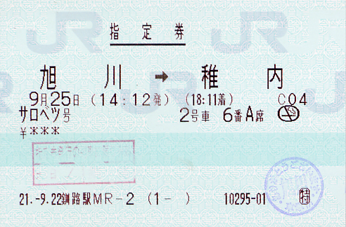 | 14:12 発 | 特急サロベツ(稚内行き) キハ182-502 2号車/3両 6番A席 普通車指定席 |