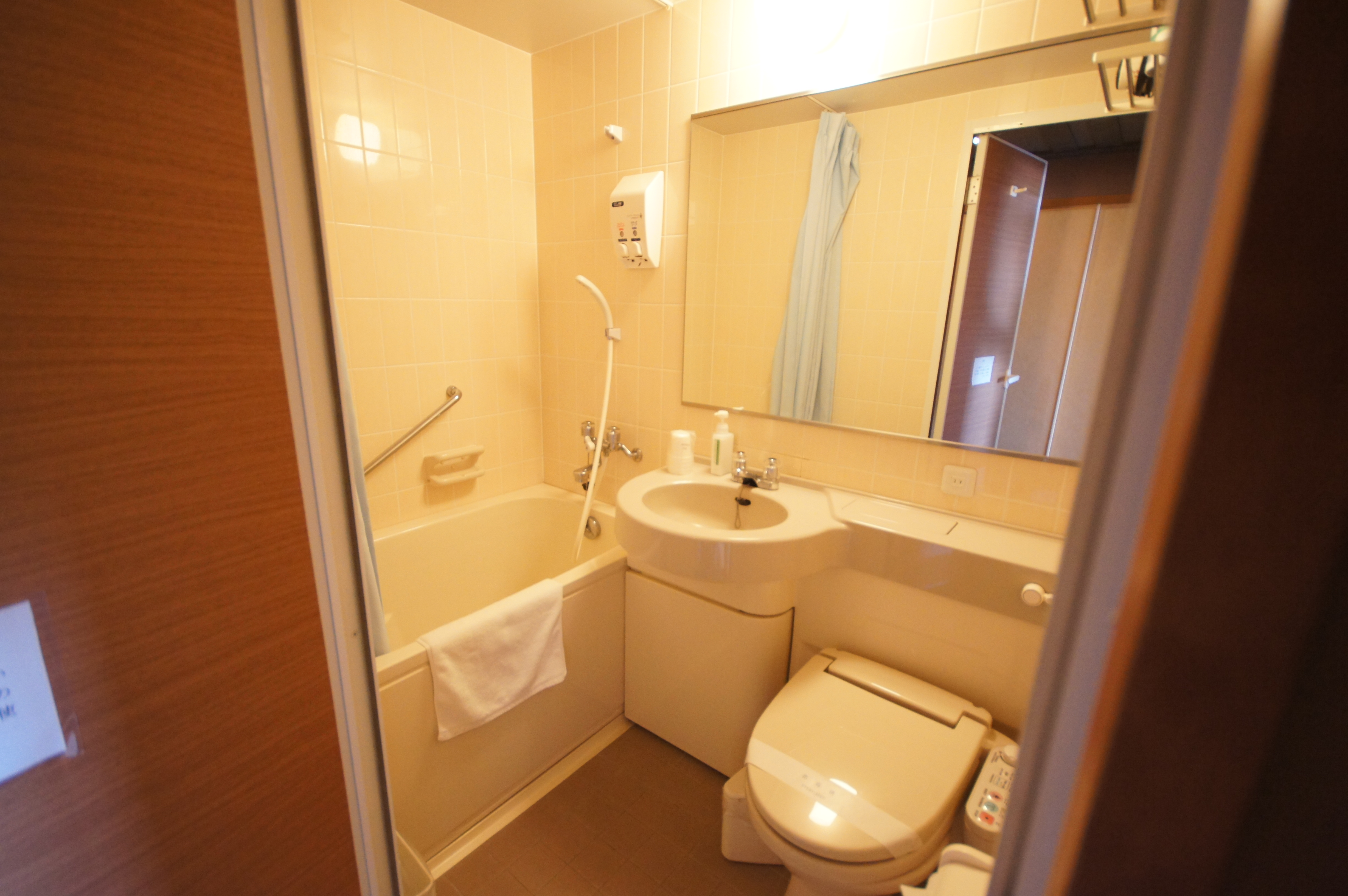 バス停から5分ほど歩いたところにホテルがあります。 チェックインすると新入社員さんが部屋まで案内してくれました。 部屋は窓から阿蘇五岳が見える和室で、設備はやや古いですがこぎれいで居心地がよいです。 最上階の展望露天風呂は貸切状態でした。 部屋に戻る途中の自販機で350mlのプレミアムモルツ(\300)を買い、ちょっと早いですが部屋で乾杯。 18時より広間で夕食、地酒の「れいざん」(300ml、\1,200)で改めて乾杯します。