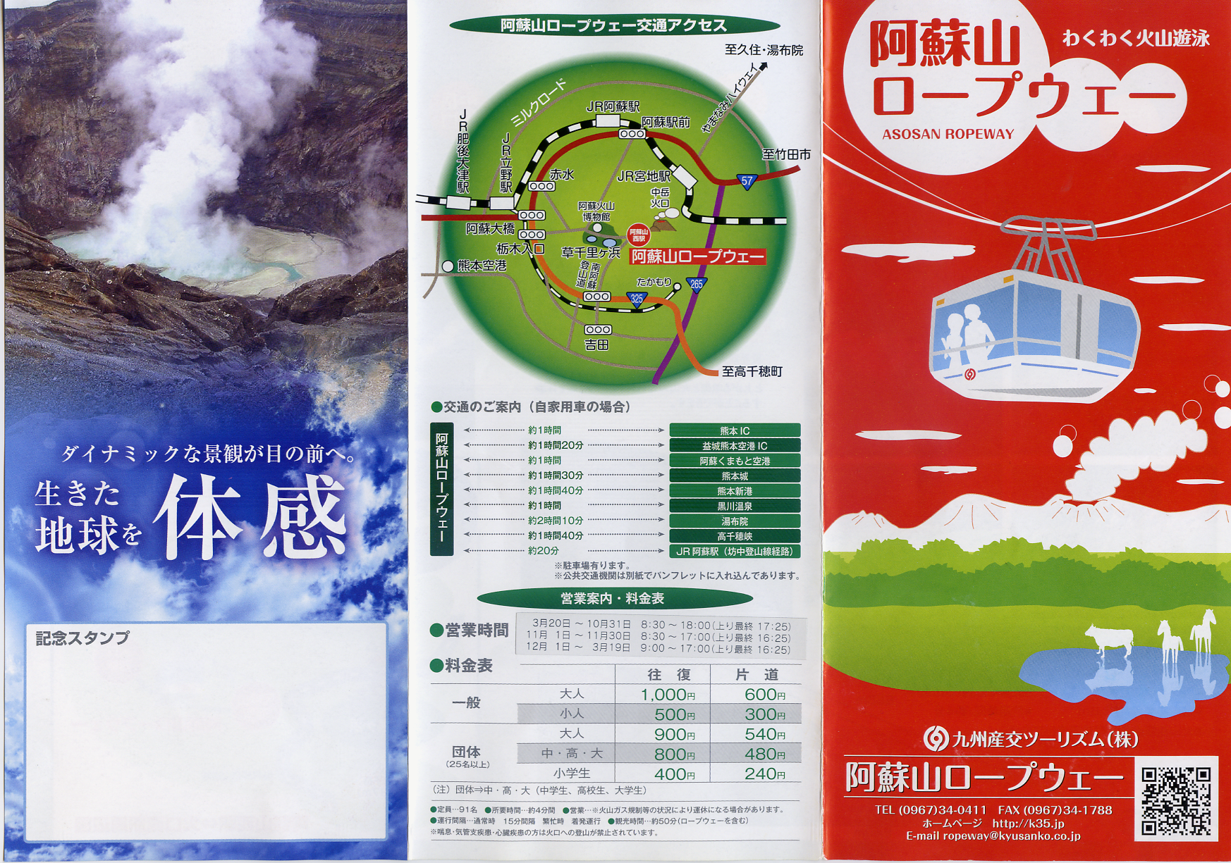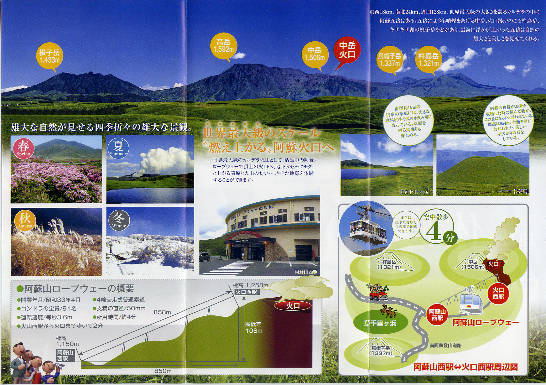 山頂までロープウェイが運行されているのですが、阿蘇山は有毒なガスを含む噴煙を吹き出しており、風向きなどの条件によっては山頂への立ち入りが制限されます。 そして今日は運悪く、山頂への立ち入りが規制されています。 12時30分頃、いったん部分的に解除されたもののすぐに規制されてしまったため、山頂には行けませんでした。 記念にロープウェイのパンフレットだけいただいておきます。
