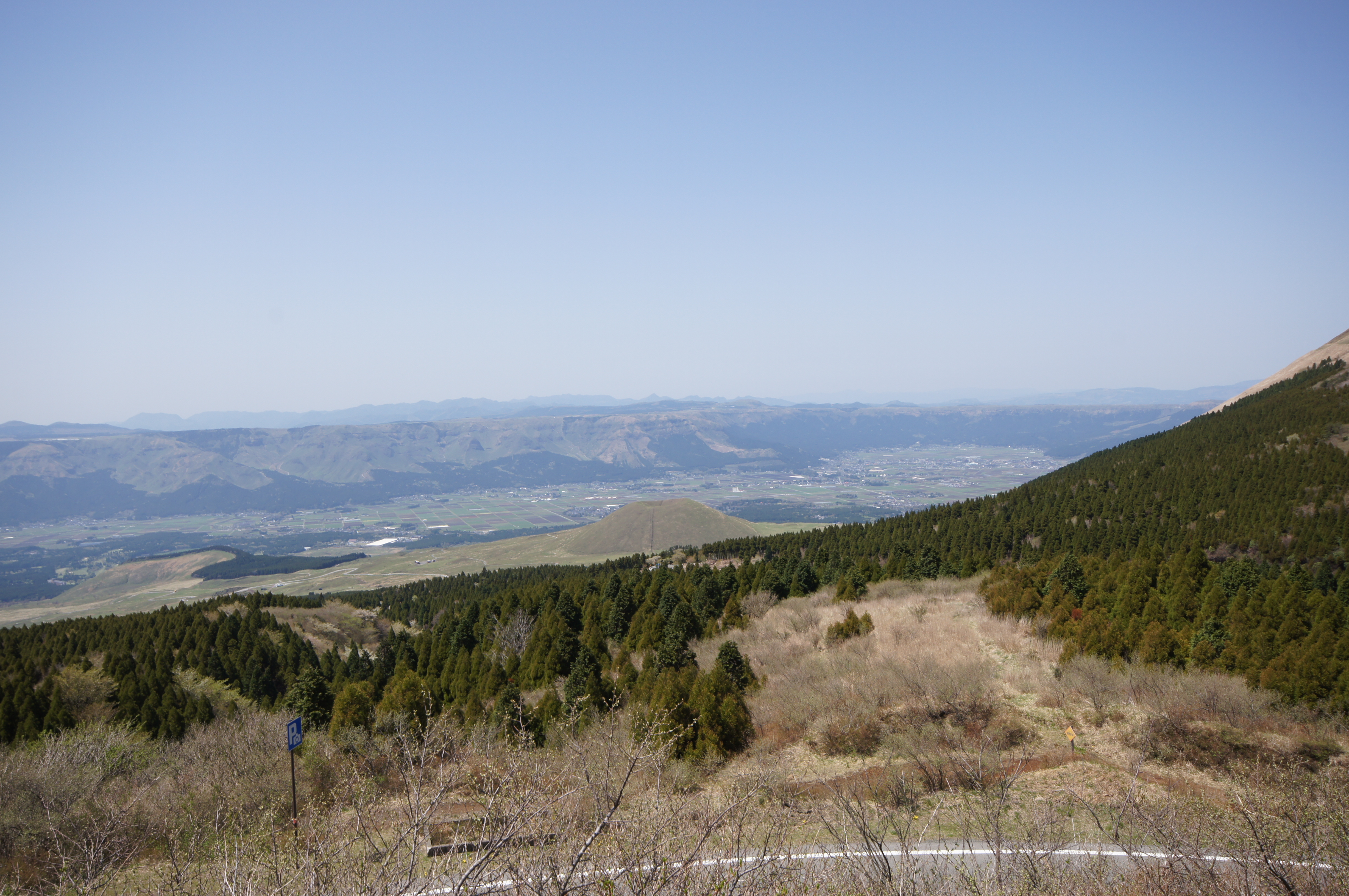 国道57号で外輪山の切れ目、立野火口瀬を通って外輪山の内側へ入ります。 山の真ん中がぺちゃんこになって残った裾の部分が外輪山で、内側からはどちらを向いても山(崖?)です。 阿蘇パノラマラインで阿蘇山を登り、12時8分に阿蘇山西到着です。