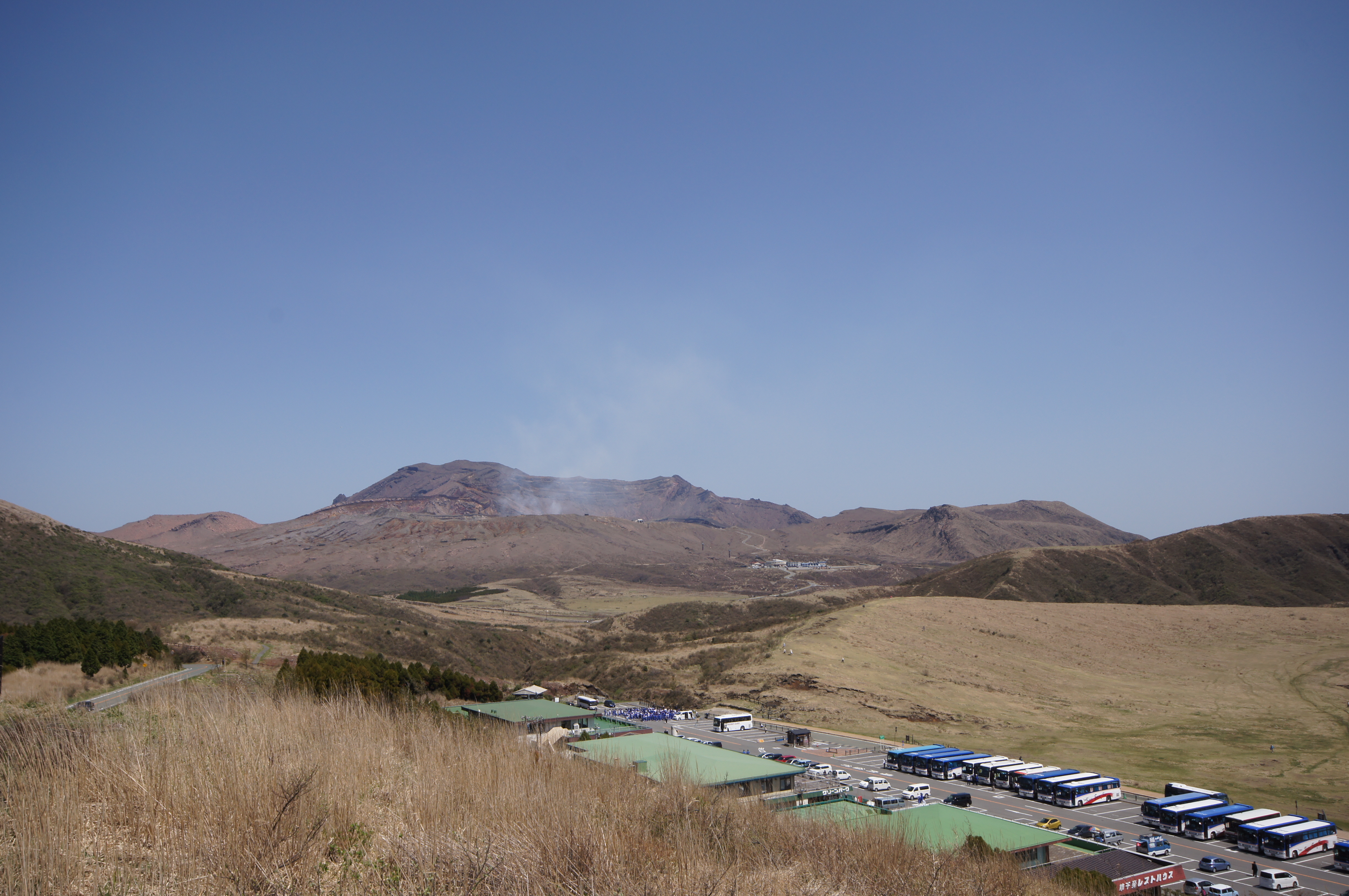 レストハウス周辺の遊歩道をぶらぶらした後、予定より少し早い13時5分のバスに乗って、草千里まで行ってしまいます。 途中に遊覧ヘリコプター乗り場があり、こちらは山頂が規制中でも飛行可能な模様です。