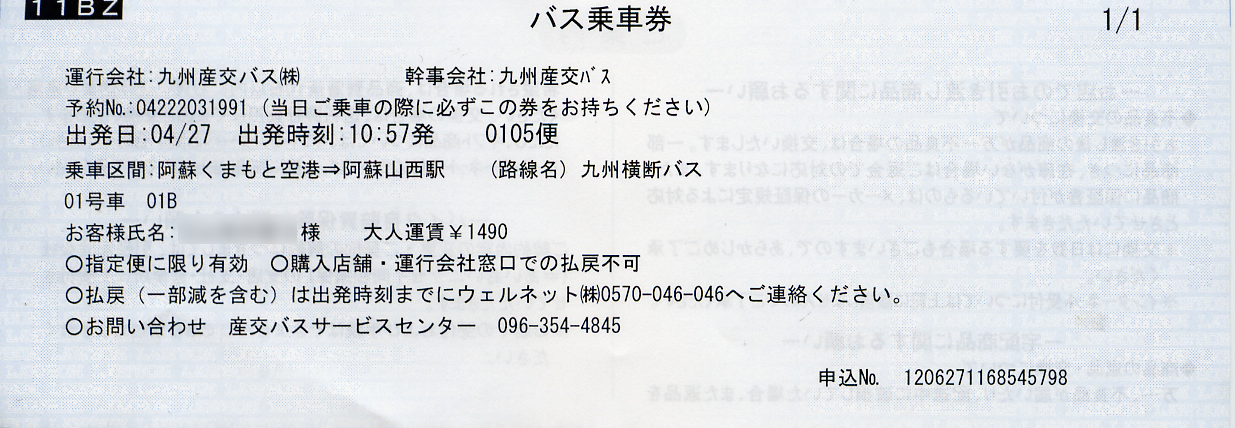 | 九州産交バス(阿蘇くまもと空港~阿蘇山西) | \1,490 |
